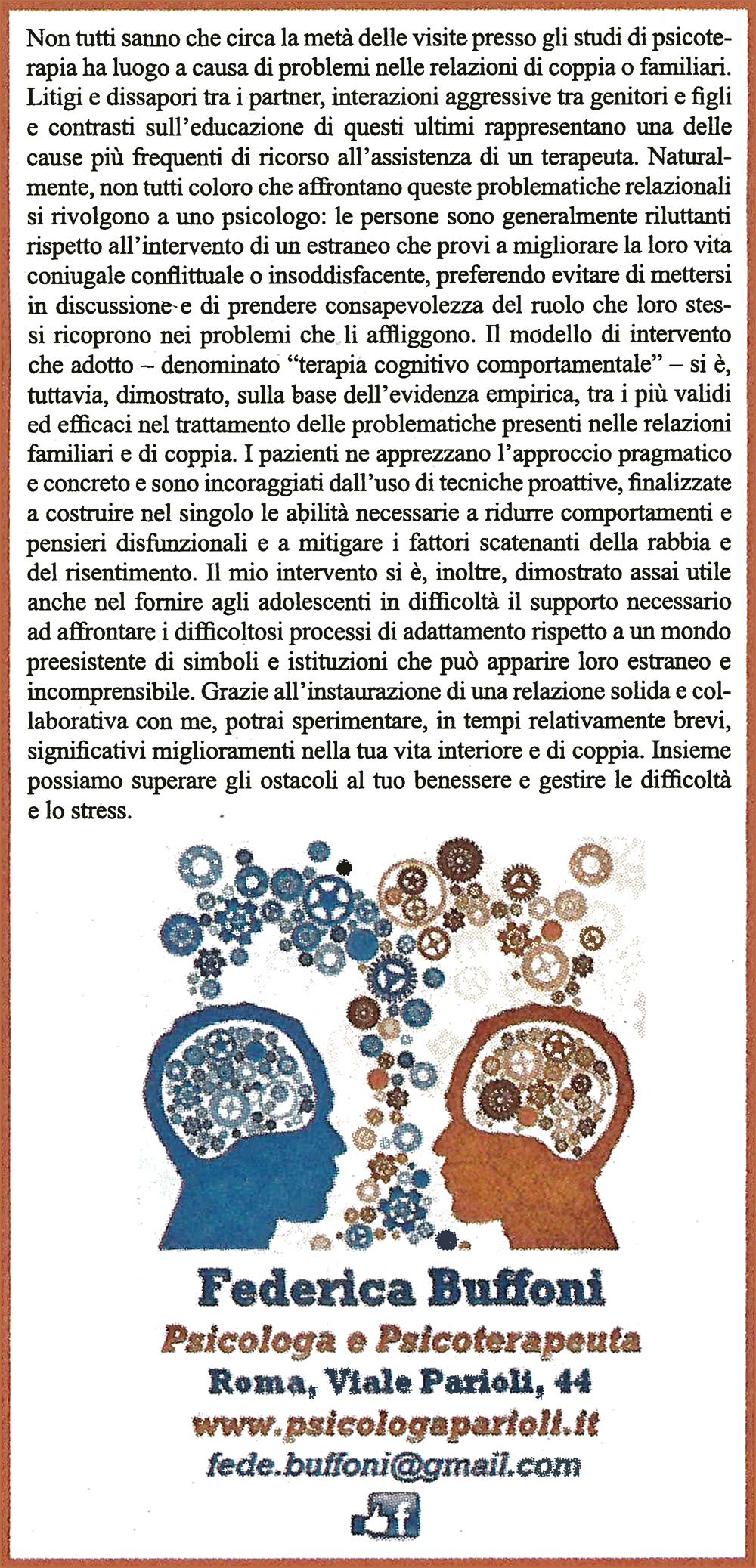 Non tutti sanno che circa la metà delle visite presso gli studi di psicoterapia ha luogo a causa di problemi nelle relazioni di coppia o familiari. Litigi e dissapori tra i partner, interazioni aggressive tra genitori e figli e contrasti sull’educazione di questi ultimi rappresentano una delle cause più frequenti di ricorso all’assistenza di un terapeuta. Naturalmente, non tutti coloro che affrontano queste problematiche relazionali si rivolgono a uno psicologo: le persone sono generalmente riluttanti rispetto all’intervento di un estraneo che provi a migliorare la loro vita coniugale conflittuale o insoddisfacente, preferendo evitare di mettersi in discussione e di prendere consapevolezza del ruolo che loro stessi ricoprono nei problemi che li affliggono. Il modello di intervento che adotto – denominato “terapia cognitivo comportamentale” – si è, tuttavia, dimostrato, sulla base dell’evidenza empirica, tra i più validi ed efficaci nel trattamento delle problematiche presenti nelle relazioni familiari e di coppia. I pazienti ne apprezzano l’approccio pragmatico e concreto e sono incoraggiati dall’uso di tecniche proattive, finalizzate a costruire nel singolo le abilità necessarie a ridurre comportamenti e pensieri disfunzionali e a mitigare i fattori scatenanti della rabbia e del risentimento. Il mio intervento si è, inoltre, dimostrato assai utile anche nel fornire agli adolescenti in difficoltà il supporto necessario ad affrontare i difficoltosi processi di adattamento rispetto a un mondo preesistente di simboli e istituzioni che può apparire loro estraneo e incomprensibile. Grazie all’instaurazione di una relazione solida e collaborativa con me, potrai sperimentare, in tempi relativamente brevi, significativi miglioramenti nella tua vita interiore e di coppia. Insieme possiamo superare gli ostacoli al tuo benessere e gestire le difficoltà e lo stress.